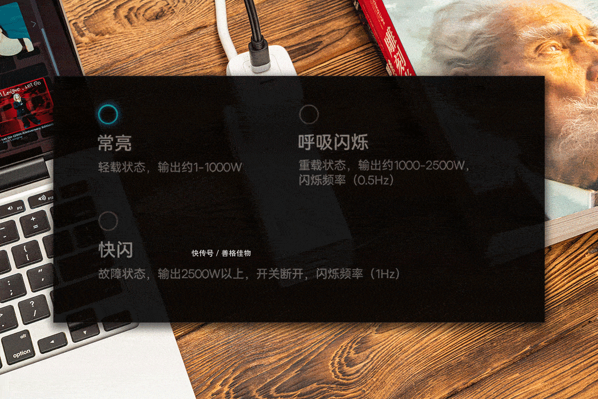 触摸开关外圈的环形LED指示灯还可以实时提示插线板当前负载状态,1-1000W为轻载,指示灯常亮;1000-2500W为重载,指示灯呼吸闪烁;2500W以上为故障状态,指示灯快闪。当插线板处于重载状态时,就要注意减载了,避免过载时突然断电。